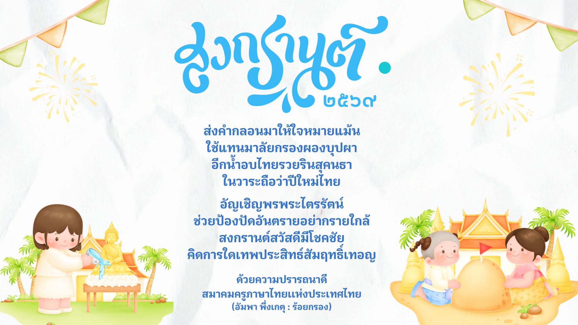 ส่งคำกลอนมาให้ใจหมายแม้น ใช้แทนมาลัยกรองผองบุปผา อีกน้ำอบไทยรวยรินสุคนธา ในวาระถือว่าปีใหม่ไทย อัญเชิญพรพระไตรรัตน์ ช่วยป้องปัดอันตรายอย่ากรายใกล้ สงกรานต์สวัสดีมีโชคชัย คิดการใดเทพประสิทธ์สัมฤ...
