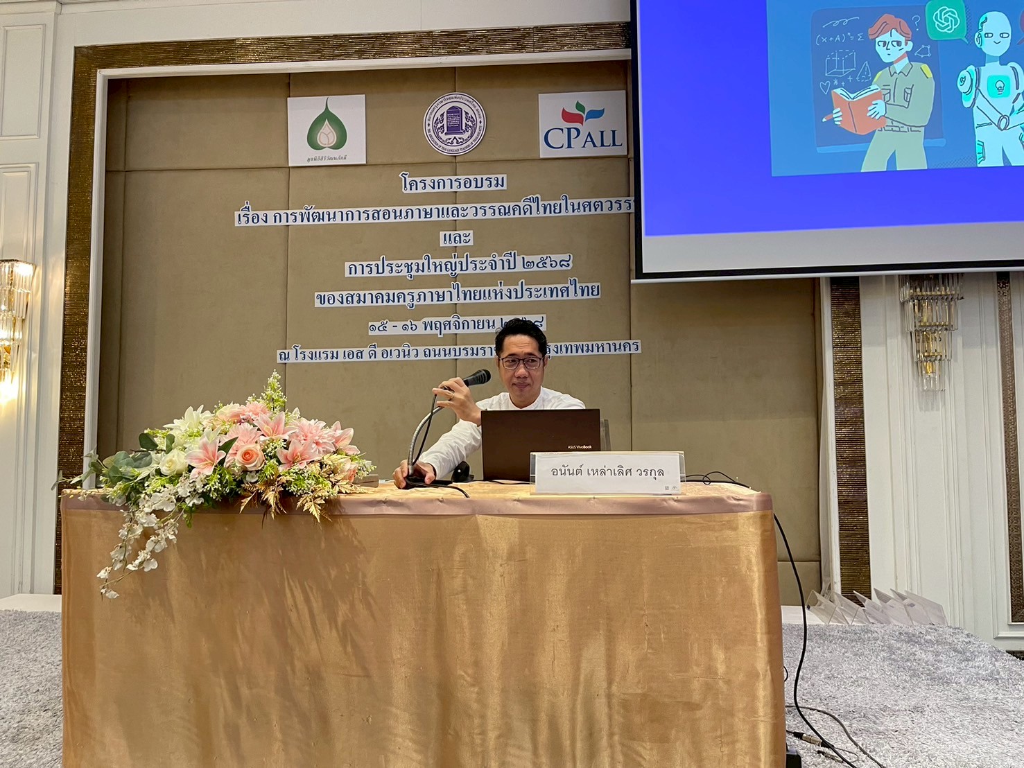 การอบรมเชิงปฏิบัติการเรื่อง “การพัฒนาการสอนภาษาและวรรณคดีไทยในศตวรรษที่ ๒๑” จัดโดยสมาคมครูภาษาไทยเเห่งประเทศไทย วันเสาร์ที่ ๑๕ พฤศจิกายน พ.ศ. ๒๕๖๘ (วันที่ ๑) ณ โรงเเรมเอ ดี อเวนิว กรุงเทพฯ กิจกรรมในวันเเรกนี้ ผู้เข้าอบรมได้เเลกเปลี่ยนเรียนรู้เกี่ยวกับความรู้เรื่อง AI ที่ครูภาษาไทยควรรู้ เทคนิคการเเต่งคำประพันธ์ตามกระบวนการคิดออกเเบบ เเละกลยุทธ์การทำเเผนการจัดการเรียนรู้ภาษาเเละวรรณคดีเเบบเชิงรุก ซึ่งจะเป็นเเนวทางในการพัฒนาการสอนภาษาไทยในชั้นเรียนต่อไป