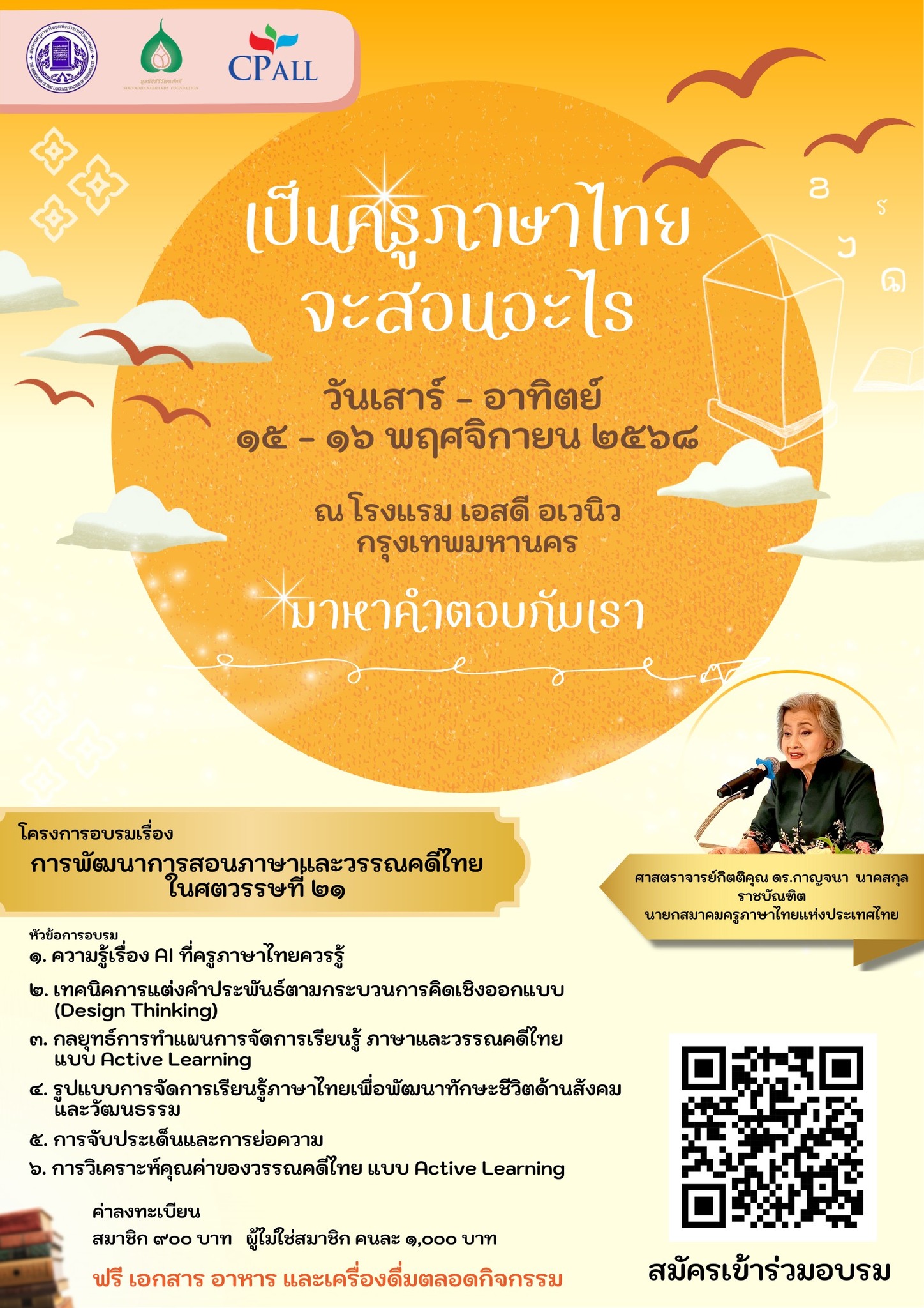 สมาคมครูภาษาไทยแห่งประเทศไทย ขอเชิญครูภาษาไทยเเละผู้สนใจร่วมอบรมเชิงปฏิบัติการเรื่อง “การพัฒนาการสอนภาษาและวรรณคดีไทยในศตวรรษที่ ๒๑” ในวันเสาร์ที่ ๑๕ ถึงวันอาทิตย์ที่ ๑๖ พฤศจิกายน พ.ศ. ๒๕๖๘ เวลา ๐๘.๐๐ – ๑๖.๓๐ น. ณ โรงแรมเอส ดี อเวนิว กรุงเทพมหานคร
