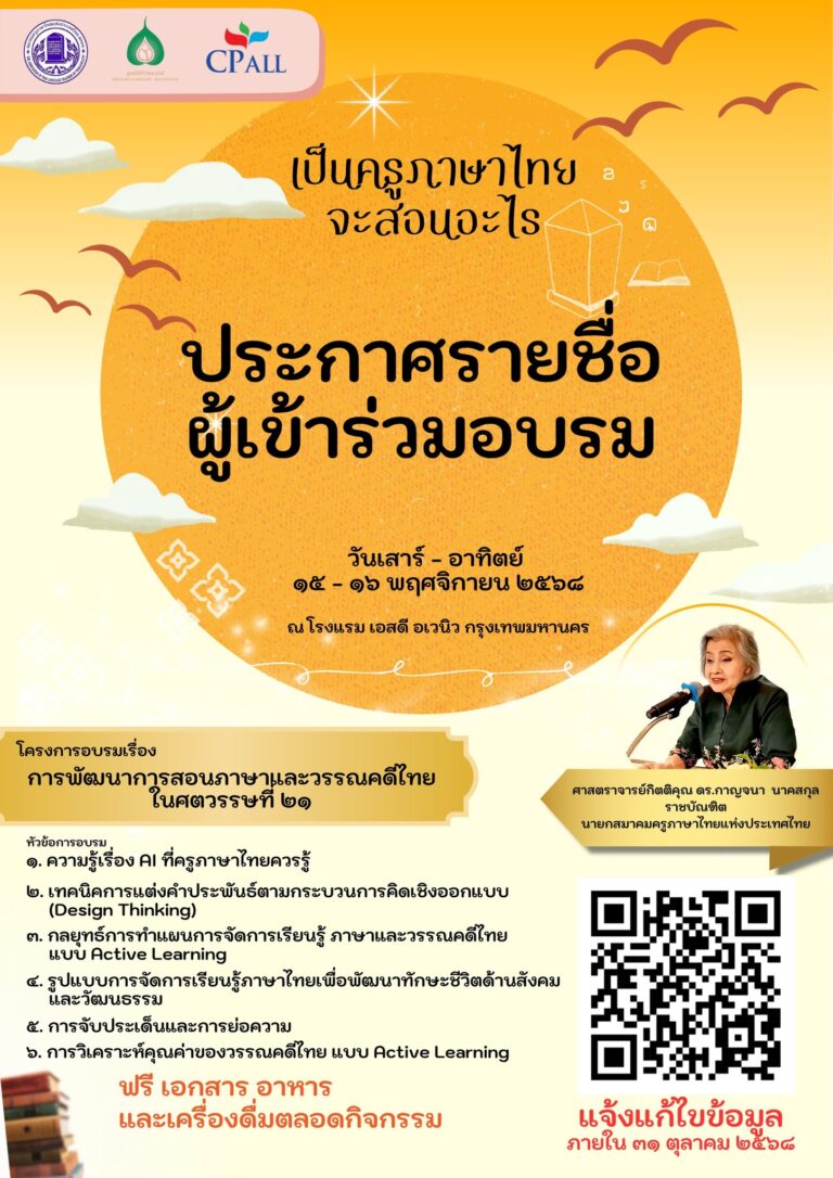 สมาคมครูภาษาไทยแห่งประเทศไทย ขอเชิญครูภาษาไทยเเละผู้สนใจร่วมอบรมเชิงปฏิบัติการเรื่อง “การพัฒนาการสอนภาษาและวรรณคดีไทยในศตวรรษที่ ๒๑” ในวันเสาร์ที่ ๑๕ ถึงวันอาทิตย์ที่ ๑๖ พฤศจิกายน พ.ศ. ๒๕๖๘ เวลา ๐๘.๐๐...
