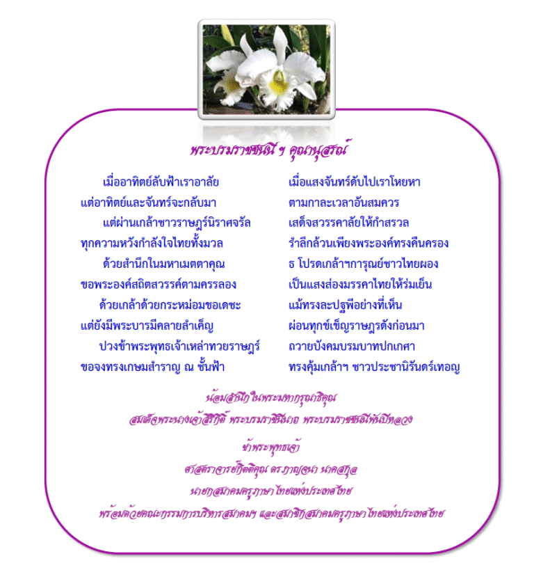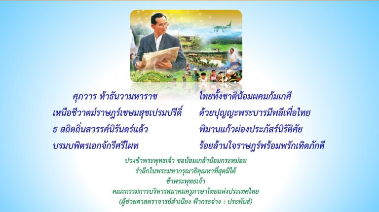 ศุภวารห้าธันวามหาราชไทยทั้งชาติน้อมผคมก้มเกศีเหนือชีวาตม์ราษฏร์เขษมสุขเปรมปรีดิ์ด้วยปุญญะพระบารมีพลีเพื่อไทยธ สถิตถิ่นสวรรค์นิรันดร์แล้วพิมานแก้วผ่องประภัสร์นิรัติศัยบรมพิตรเอกจักรีศรีไผทร้อยล้านใจราษ...