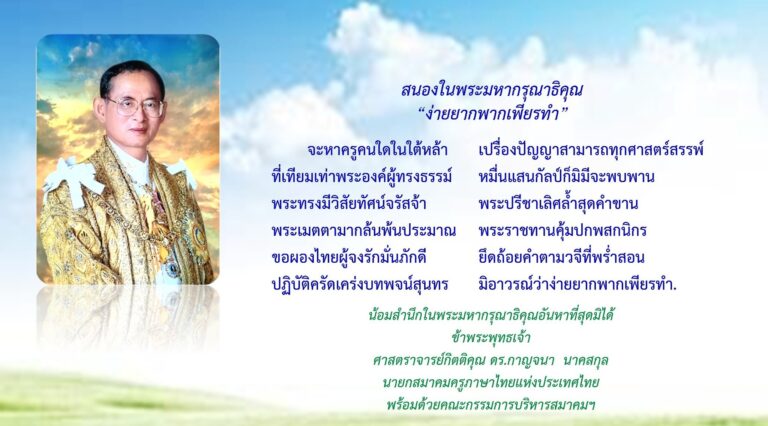 สนองในพระมหากรุณาธิคุณ “ง่ายยากพากเพียรทำ” จะหาครูคนใดในใต้หล้า ปรื่องปัญญาสามารถทุกศาสตร์สรรพ์ ปรื่องปัญญาสามารถทุกศาสตร์สรรพ์ หมื่นแสนกัลป์ก็มิมีจะพบพาน พระทรงมีวิสัยทัศน์จรัสจ้า พระปรีชาเลิศ...